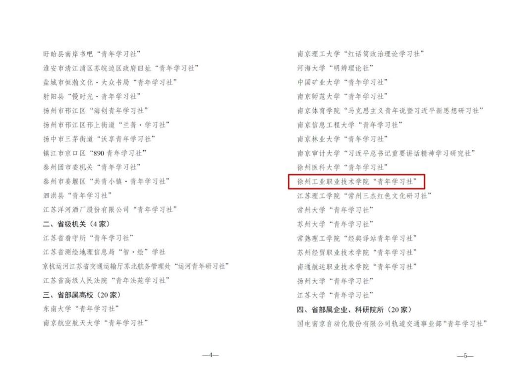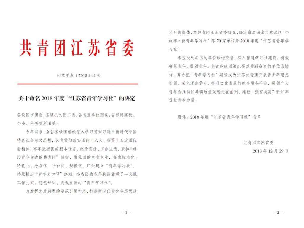近日,共青团江苏省委下发《关于命名2018年度“江苏省青年学习社”的决定》,我校“青年学习社”被命名为2018年度“江苏省青年学习社”(全省共20所高校,其中高职院校3所)。