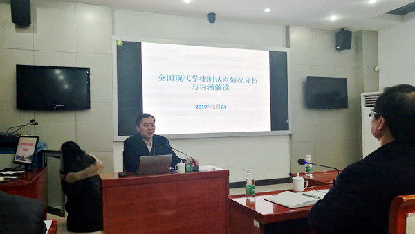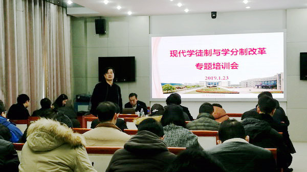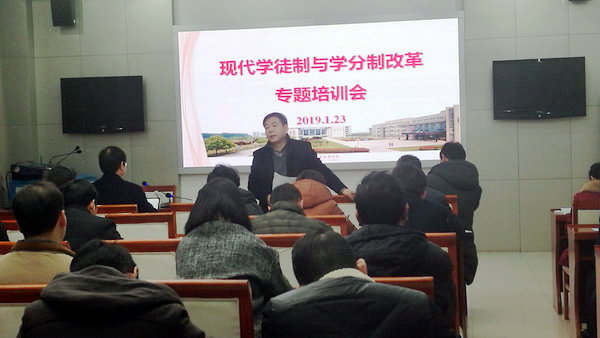 1月23日,我校在图书馆视频会议室召开了现代学徒制与学分制改革专题培训会,党委书记祝木伟、院长张登宏、副院长张芳儒,教务处、各二级学院(部)负责人,各专业带头(负责)人参加了会议。会议由张芳儒副院长主持。