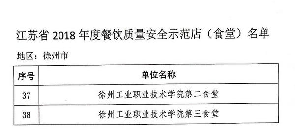 近日,江苏省市场监督管理局下发文件(苏市监办【2019】52号)《关于公布2018年度江苏省餐饮质量安全示范街(区)和示范店(食堂)名单的通知》,我校第二食堂、第三食堂分别获得“2018年度江苏省餐饮质量安全示范食堂”的称号。