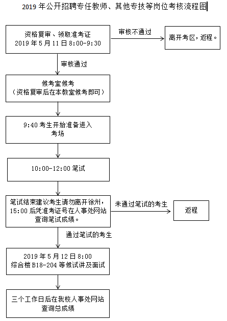 笔试成绩公布:建议考生笔试考试结束后请勿离开徐州,2019年5月11日15:00以后可在人事处网站凭准考证查询成绩,同时公布进入试讲及面试的考生名单,请注意试讲及面试时间按时参加。