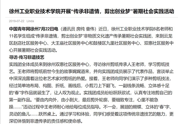 近日,乐动网站网页版6名老师和11名学生组成“传承非遗情,剪出创业梦”非物质文化遗产传承暑期社会实践团,来到云龙区赵店社区服务中心、大王庙社区服务中心和鼓楼区九里社区服务中心、双惠社区服务中心开展暑期社会实践活动。