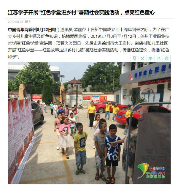 在新中国成立七十周年到来之际,为了在广大乡村儿童中普及红色知识,培植爱国热情,2019年7月6日至7月12日,乐动网站网页版“红色学堂”宣讲团,顶着炎炎烈日,先后走进徐州市大王庙村、赵店村和九里社区开展“红色学堂——红色故事走进乡村儿童”暑期社会实践活动,传播红色理论,撒播“红色种子”。