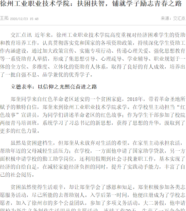 贫困虽然使得生活艰辛,却让郑奎学会了感恩和知足。郑奎积极参加各类志愿服务活动,尽己所能的去帮助别人。入学后第一时间,他便注册成为了学校志愿者,加入了徐州市的多个公益团队,参加了多项义务活动。大二暑假,他申请留校为新生义务制作生活用品的志愿活动,连续工作20天,生产了一万余个脸盆。在今年的新冠疫情防控中,郑奎主动报名参加了村疫情防控志愿者,协助村委会完成了疫情信息统计登记、卡点执勤、防控宣传等多项防疫志愿工作。十多天的志愿结束时,村支书竖起大拇指对郑奎说“小伙,好样的!”