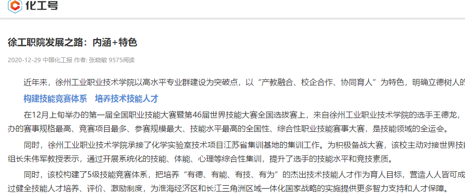 同时,该校构建了5级技能竞赛体系,把培养“有德、有能、有技、有为”的杰出技术技能人才作为育人目标,营造人人皆可成才、人人尽展其才的良好环境。在2020年的江苏省职业院校技能大赛中,该校学生荣获一等奖2个、二等奖6个、三等奖8个。该校还通过健全技能人才培养、评价、激励制度,为淮海经济区和长江三角洲区域一体化国家战略的实施提供更多智力支持和人才保障。