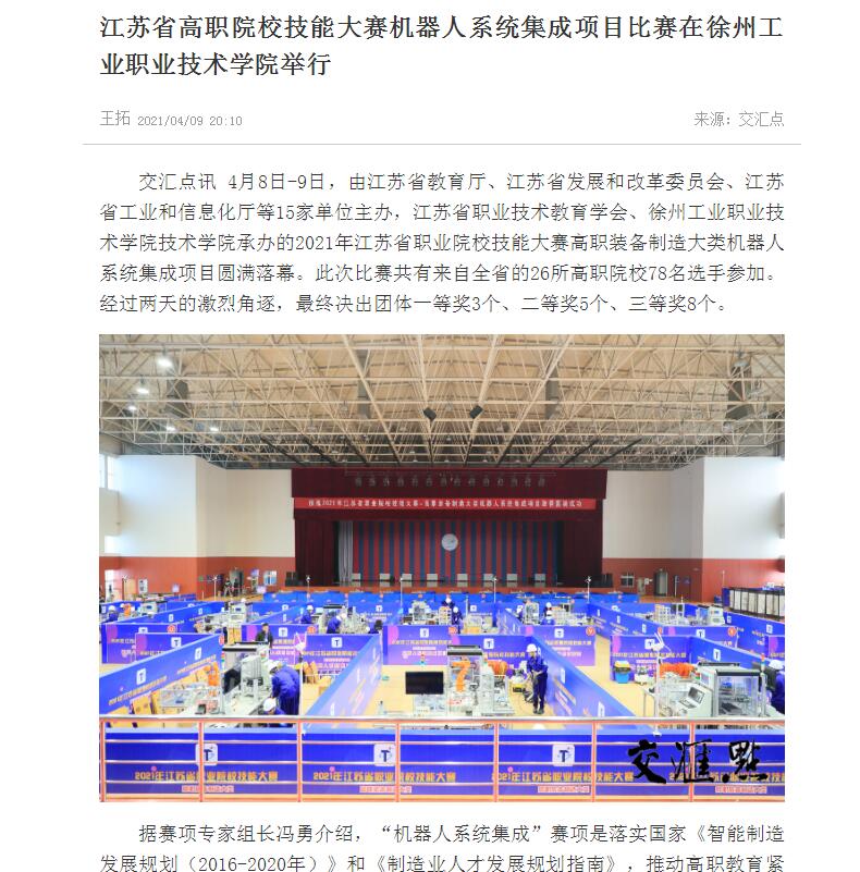 交汇点讯4月8日-9日,由江苏省教育厅、江苏省发展和改革委员会、江苏省工业和信息化厅等15家单位主办,江苏省职业技术教育学会、乐动网站网页版技术学院承办的2021年江苏省职业院校技能大赛高职装备制造大类机器人系统集成项目圆满落幕。此次比赛共有来自全省的26所高职院校78名选手参加。经过两天的激烈角逐,最终决出团体一等奖3个、二等奖5个、三等奖8个。