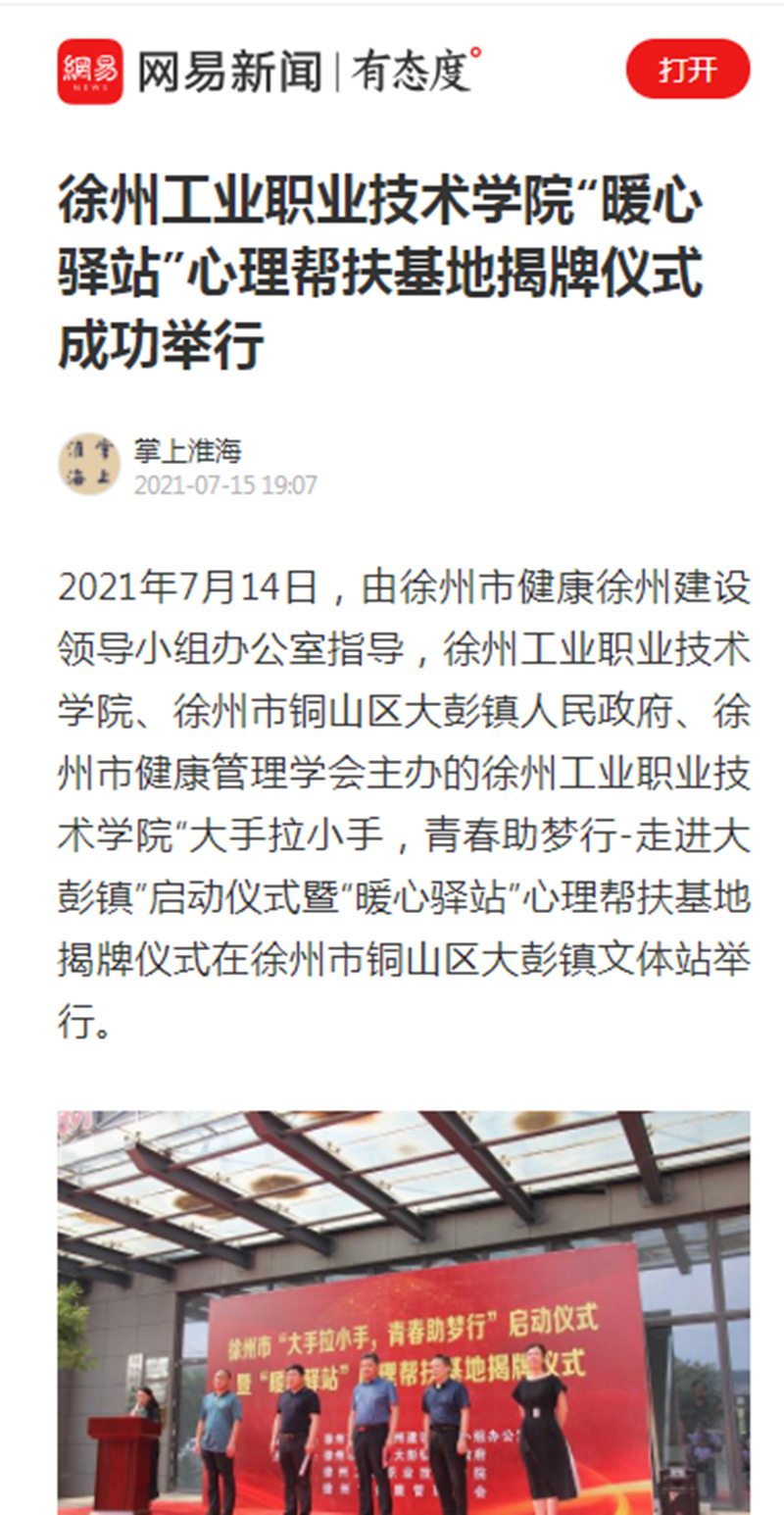 2021年7月14日,由徐州市健康徐州建设领导小组办公室指导,乐动网站网页版、徐州市铜山区大彭镇人民政府、徐州市健康管理学会主办的乐动网站网页版“大手拉小手,青春助梦行-走进大彭镇”启动仪式暨“暖心驿站”心理帮扶基地揭牌仪式在徐州市铜山区大彭镇文体站举行。