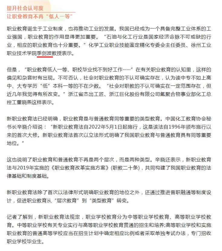 新职业教育法已经明确,职业教育是与普通教育同等重要的类型教育。中国化工教育协会秘书长辛晓介绍说:“新职业教育法自2022年5月1日起施行,这是该法自1996年颁布施行以来的首次大修。新职业教育法首次以立法形式明确了我国职业教育与普通教育具有同等重要地位。”