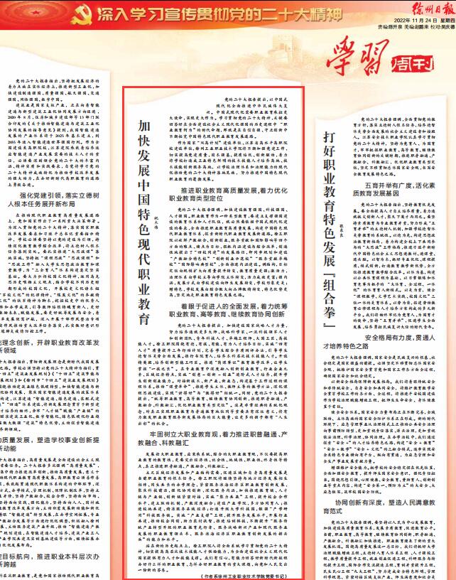 站在新的历史起点上,徐工职院人将全面系统学习贯彻党的二十大精神,切实提高高层次技术技能人才供给能力,为全面建设社会主义现代化国家提供有力人才和技能支撑。我们有信心、有能力回答好新时代新征程办好什么样的职业教育、怎样办好职业教育的重大课题,向党和人民交出一份新的优异答卷。