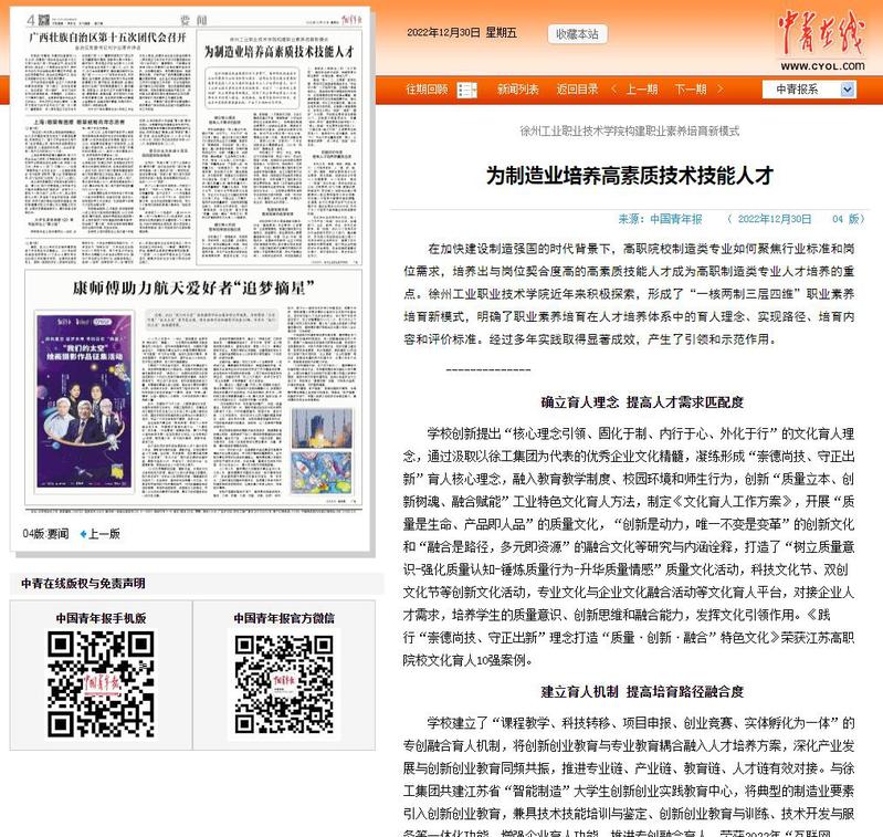 学校创新提出“核心理念引领、固化于制、内行于心、外化于行”的文化育人理念,通过汲取以徐工集团为代表的优秀企业文化精髓,凝练形成“崇德尚技、守正出新”育人核心理念,融入教育教学制度、校园环境和师生行为,创新“质量立本、创新树魂、融合赋能”工业特色文化育人方法,制定《文化育人工作方案》,开展“质量是生命、产品即人品”的质量文化,“创新是动力,唯一不变是变革”的创新文化和“融合是路径,多元即资源”的融合文化等研究与内涵诠释,打造了“树立质量意识-强化质量认知-锤炼质量行为-升华质量情感”质量文化活动,科技文化节、双创文化节等创新文化活动,专业文化与企业文化融合活动等文化育人平台,对接企业人才需求,培养学生的质量意识、创新思维和融合能力,发挥文化引领作用。《践行“崇德尚技、守正出新”理念打造“质量·创新·融合”特色文化》荣获江苏高职院校文化育人10强案例。