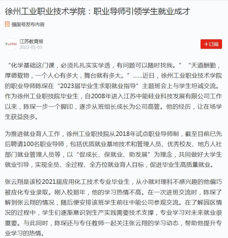 “得益于这一创新机制的推动和职业导师们的倾情投入,目前我校学生参与职业规划率达100%,多次荣获江苏省大学生职业生涯规划大赛一等奖。在推进校企合作、提高毕业生就业满意度和用人单位对毕业生满意度方面,职业导师也发挥了积极作用。”据徐州工业职技院学工处处长阮浩介绍,导师们根据学生特点及发展愿望,指导学生进行职业生涯规划,帮助他们寻求最佳职业发展方向,并积极发挥传帮带作用,为学生提供优质实习机会和就业岗位。