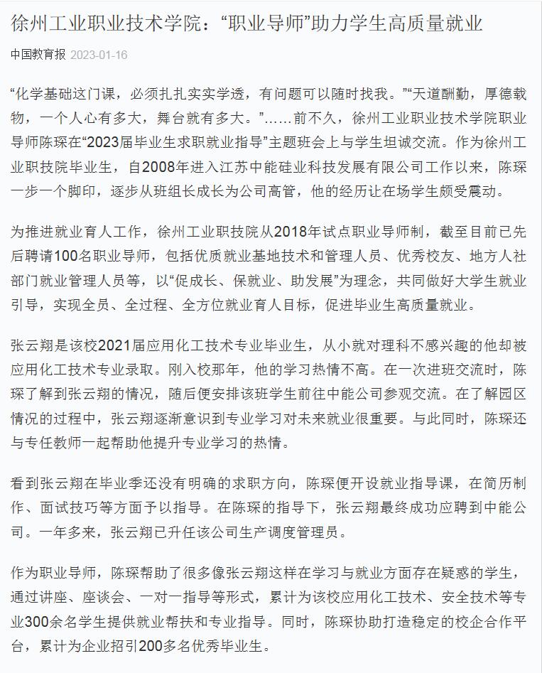 2021年毕业季,看到张云翔还没有明确的求职方向,陈琛便适时开设就业指导课,在简历制作、面试技巧等方面予以详实指导。在陈琛的引领下,张云翔最终成功应聘到中能公司。一年多来,张云翔已升任该公司生产调度管理员,迈出了职业生涯的重要一步。
