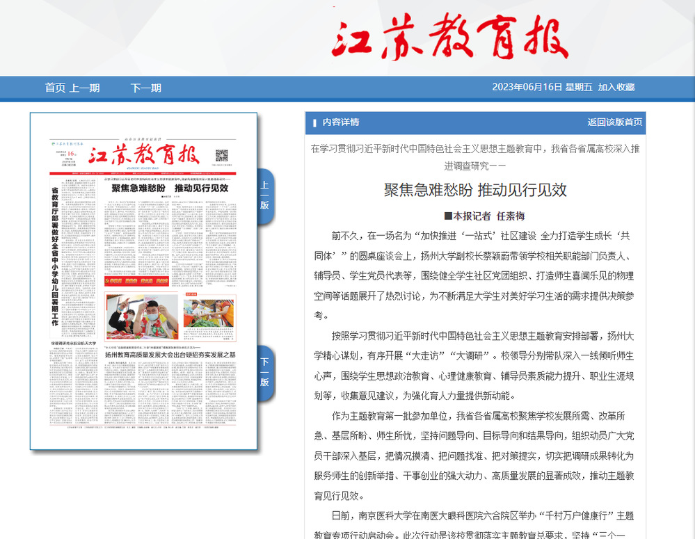 按照学习贯彻习近平新时代中国特色社会主义思想主题教育安排部署,扬州大学精心谋划,有序开展“大走访”“大调研”。校领导分别带队深入一线倾听师生心声,围绕学生思想政治教育、心理健康教育、辅导员素质能力提升、职业生涯规划等,收集意见建议,为强化育人力量提供新动能。