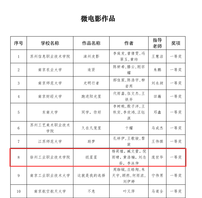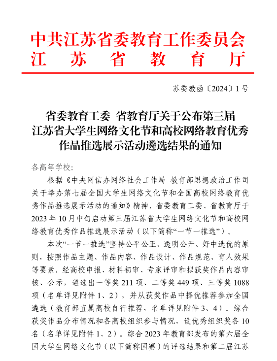 近日,江苏省委教育工委、省教育厅公布了第三届江苏省大学生网络文化节和高校网络教育作品推选展示活动评选结果。我校报送作品获11个奖项,其中一等奖1项,二等奖1项,三等奖9项。同时,我校有5个作品被推选参加第七届全国大学生网络文化节和全国高校网络教育优秀作品推选展示活动。