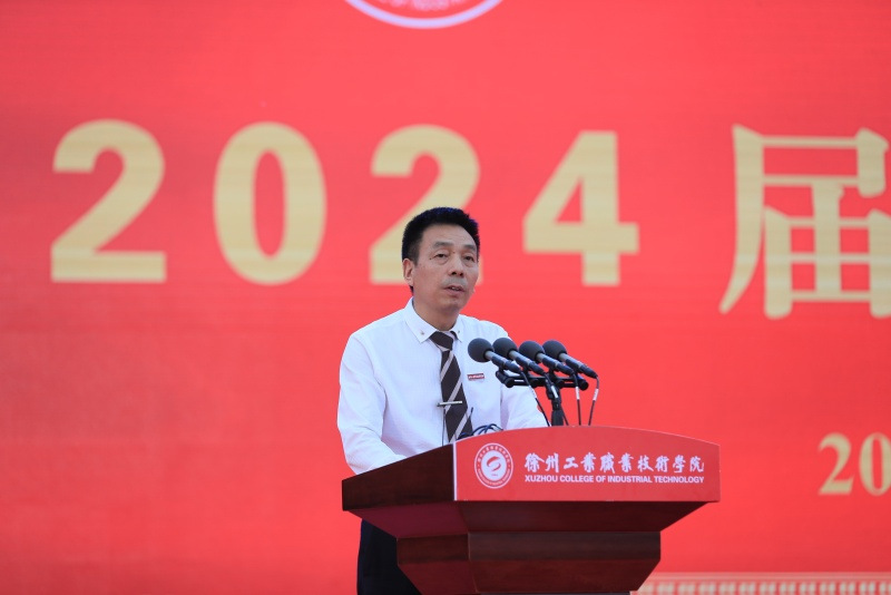 典礼在雄壮的国歌声中拉开帷幕。校长鲍桂楠代表学校向即将开启人生新篇章的毕业生们致以热烈祝贺,向所有为学生成长成才倾注无数心血的师长、家长表示崇高敬意和诚挚感谢!他以《练就“真”功夫,勇做“实”力派,拿出“精”气神,逐梦“新”时代》为题,回顾了同学们在工院求学过程中,与校同频的生动实践和丰硕成果,并为全体同学送上离别赠言:学校为你们感到骄傲!学校对你们充满期待!希望你们常回家看看!希望毕业生们带着“求真求实求精求新”的校训出发,在未来的人生道路上,用脚步丈量祖国大地,用眼睛发现中国奇迹,用耳朵倾听人民呼声,用内心感受时代精神,以实践淬炼青春,以拼搏磨砺意志,练就岗位技能“真”功夫,争做技能报国“实”力派,拿出实干担当“精”气神,展现建功立业“新”作为,在推进强国建设、民族复兴伟业中,奋力书写为中国式现代化挺膺担当的青春篇章!同时也期待着大家奋力书写属于自己的精彩故事,以优异成绩为母校争得荣光!