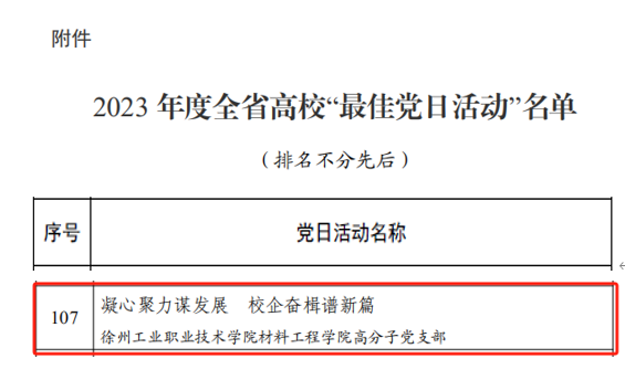 近日,中共江苏省委教育工作委员会下发《省委教育工委关于公布2023年度全省高校“最佳党日活动”名单的通知》(苏委教组函〔2024〕23号),经各高校申报、专家组评审、省委教育工委专题办公会研究,我校材料工程学院党总支高分子党支部“凝心聚力谋发展 校企奋楫谱新篇”党日活动主题鲜明、内容丰富、生动活泼、富有实效,获评2023年度江苏高校最佳党日活动。