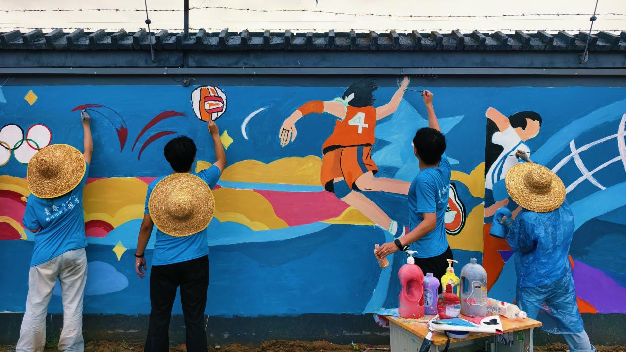 共绘强国梦想,激扬青春力量。实践团成员携手来到体育场,以笔为媒,将“体育强国”的壮志豪情挥洒于校园墙壁,绘就一幅幅生动的体育画卷。灵动的线条与明快的色彩交织,跃动的运动身影与昂扬的拼搏姿态跃然墙面,无声传递着健康向上的时代强音,筑就一道鼓舞人心的风景线。