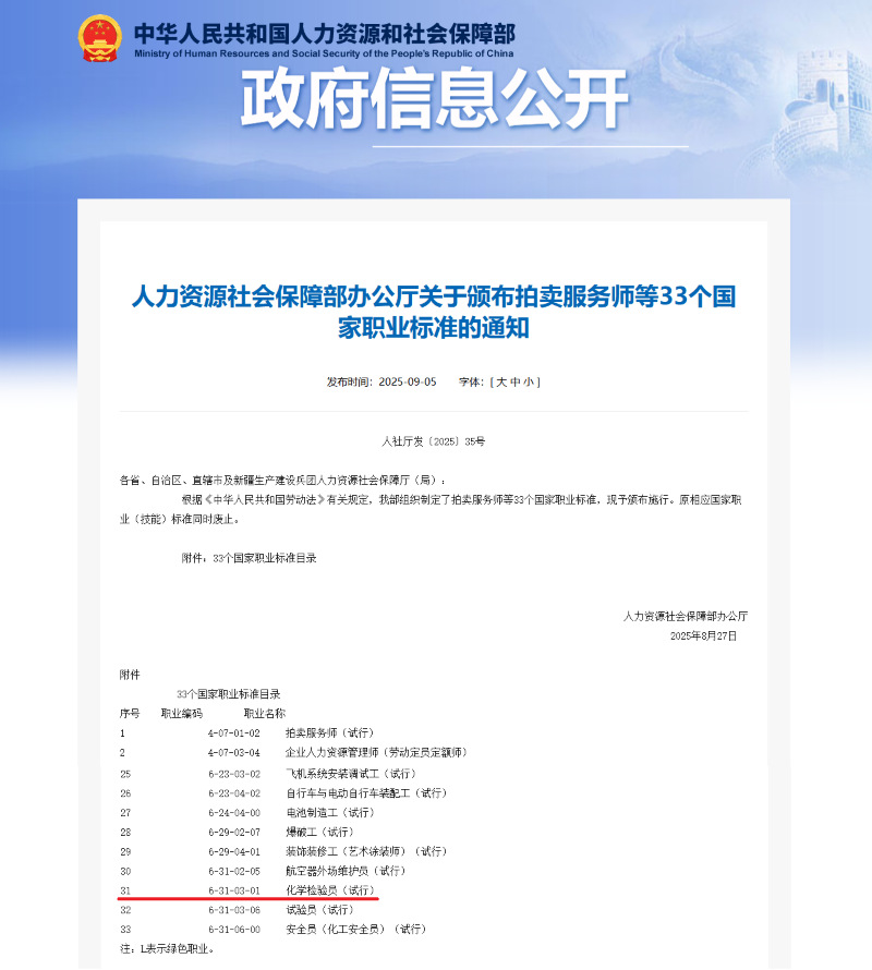 近日,人力资源和社会保障部办公厅印发《关于颁布拍卖服务师等33个国家职业标准的通知》(人社厅发〔2025〕35号),由我校作为第一单位编写的《化学检验员》(职业编码:6-31-03-01)国家职业标准位列其中。这标志着我校在参与国家职业标准制定、引领职业教育高质量发展方面取得了又一重大标志性成果。