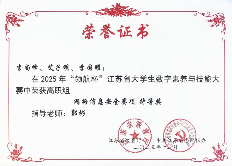 “领航杯”江苏省教育数字化应用能力大赛是由省教育厅主办的全省教育数字化领域极具影响力的重要精品赛事之一。其中“领航杯”大学生数字素养与技能大赛设网络信息安全、人工智能应用两个赛项,围绕人工智能、网络安全等数字时代核心能力展开,旨在全面提升师生数字素养与创新实践水平。网络信息安全赛项教师组、学生组均凭借娴熟技术和稳定发挥以全场最高分获得特等奖,实现“双冠”历史性突破,人工智能应用赛项获得一等奖、二等奖各2项。“领航杯”教师数字素养提升实践活动注重全面考察参赛作品的教学设计、内容深度、技术融合度及创新思维,获奖成果是对教师教学能力与数字素养的权威认证,我校获得特等奖、一等奖、二等奖各1项。